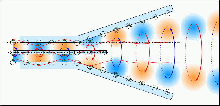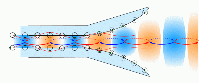 後続の電流が発する磁界に押されて、開口部から出射されて電波となる。