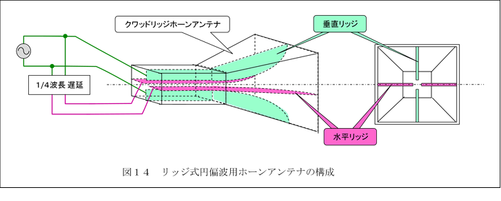 なお、円偏波の磁界を効率よく発するためには、例えば、図14のように板状リッジを4枚備えた