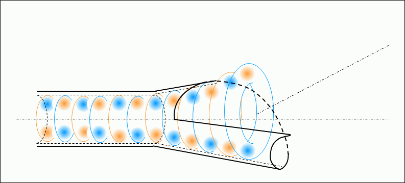 円錐ホーンアンテナの円錐通電部の直径拡大にしたがって、次第に通電部から離れ、