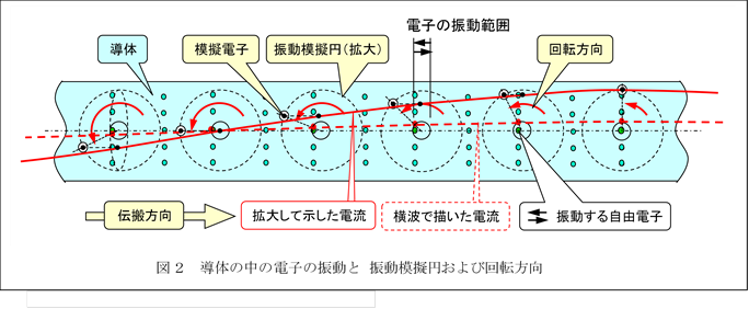 図1は、進行波の交流電流が流れる導線の中で振動する電子の様子を 模擬的に示したもので、
