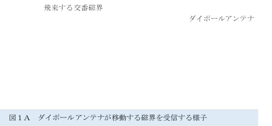 図1に示すように、飛来する(移動する)交番磁界(電波)が、棒状(線状)の導体である ロッドアンテナあるいは ダイポールアンテナを通過すれば、アンテナ内に起電力が生じて電流が流れ、移動する磁界に対応する電流が出力部から出力される。