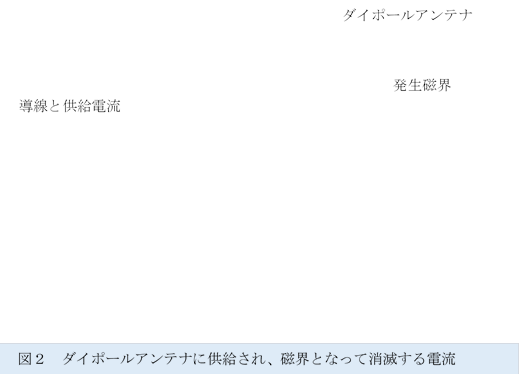 図2は、一対の導線によってアンテナに供給された平衡信号(交流電流)が、アンテナの中を周囲に磁界を生成しながら通過して、次第に減衰する様子を模式的に示す。