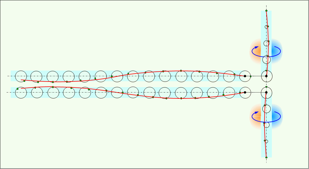 上記のように、電流はダイポールアンテナを通過する過程で、永久磁石のような磁界を生成することと、それを放射方向に光速で押すことで、順次減少し、アンテナの先端に至る前に消滅する。図では、生成された電流が順次減衰する様子、すなわち、電子の振動振幅が小さくなる様子を、振動模擬円を順次小さくすることで表し、アンテナ先端部の模擬円を点にすることで、電流が消滅し、電子が振動しないことを示す。なお、破線で示す大きさが変わらない振動模擬円は、各位置の電子の位相を示すための参考用で、導線を流れる電流のように電子の振動振幅が変わらない電流に対応する振動模擬円である。