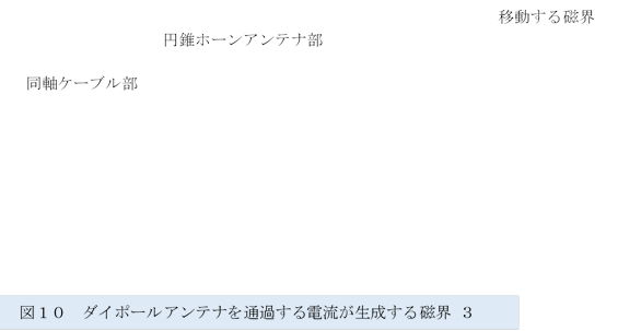 図10は、同軸ケーブルから円錐ホーンアンテナに至る通電電流と、当通電電流が生成する磁界の様子を示したもので、上記のように振動模擬円を用いて電子の挙動を表し、移動方向を回転軸としたリング状の磁界が生成され、後続の極性が反転したリング状の磁界によって開口部から押し出される様子を模式的に示す。