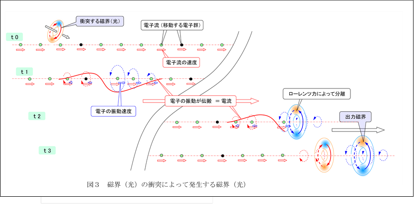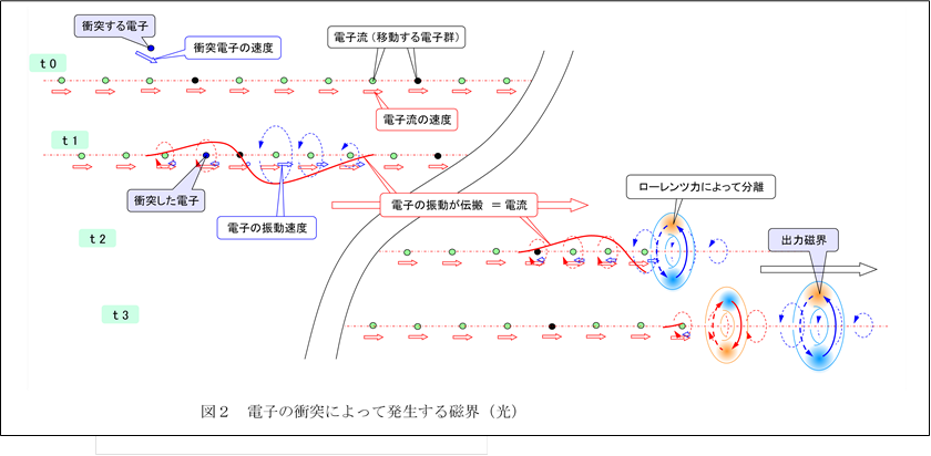 図3は、移動する磁界(光)が電子流に衝突して、電子流中の電子に振動を発生し、